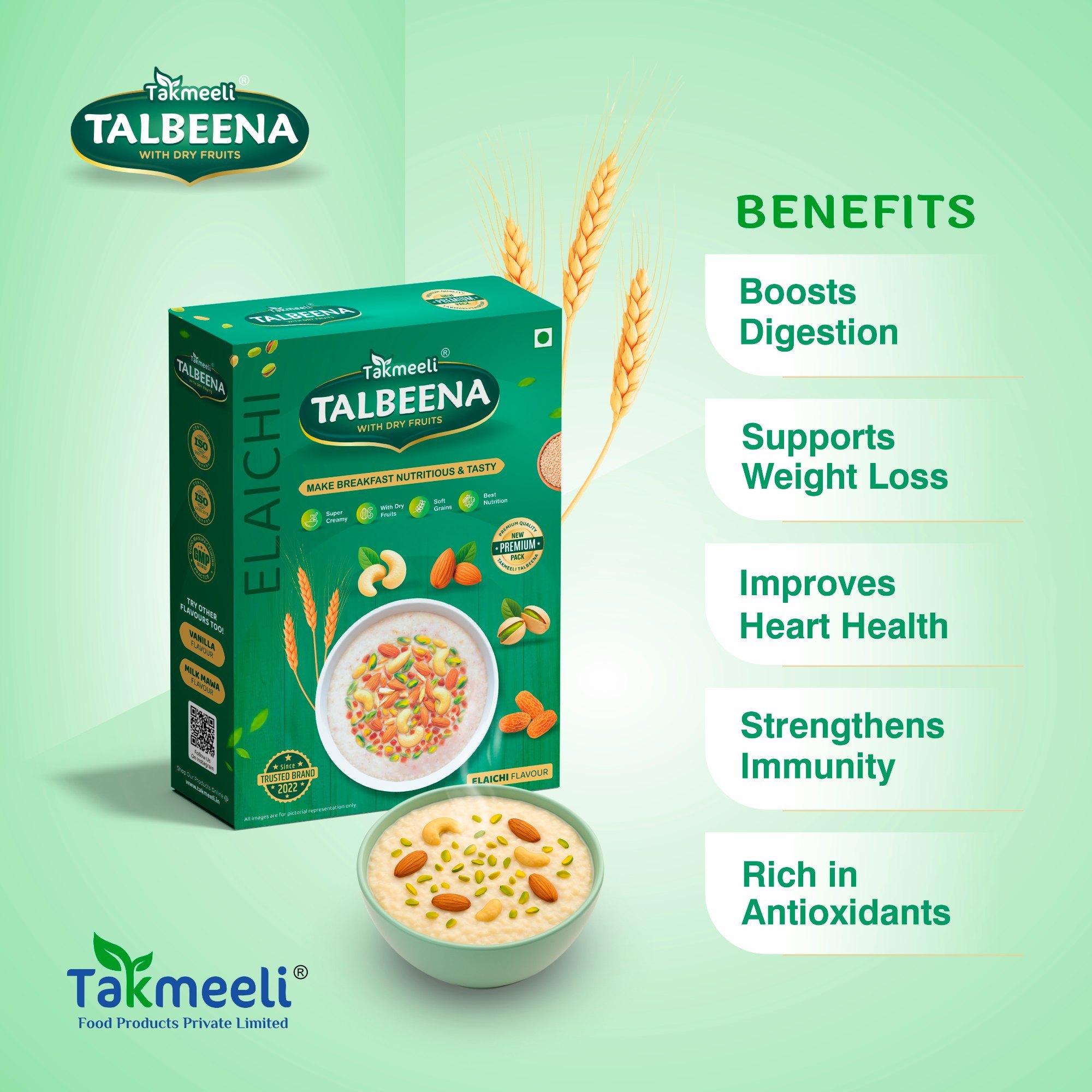 Takmeeli Talbeena Elaichi Flavour is a nutritious and comforting barley-based preparation inspired by traditional wellness foods. Made from high-quality barley and enhanced with the soothing aroma of elaichi (cardamom), it is easy to digest and ideal for daily nourishment.